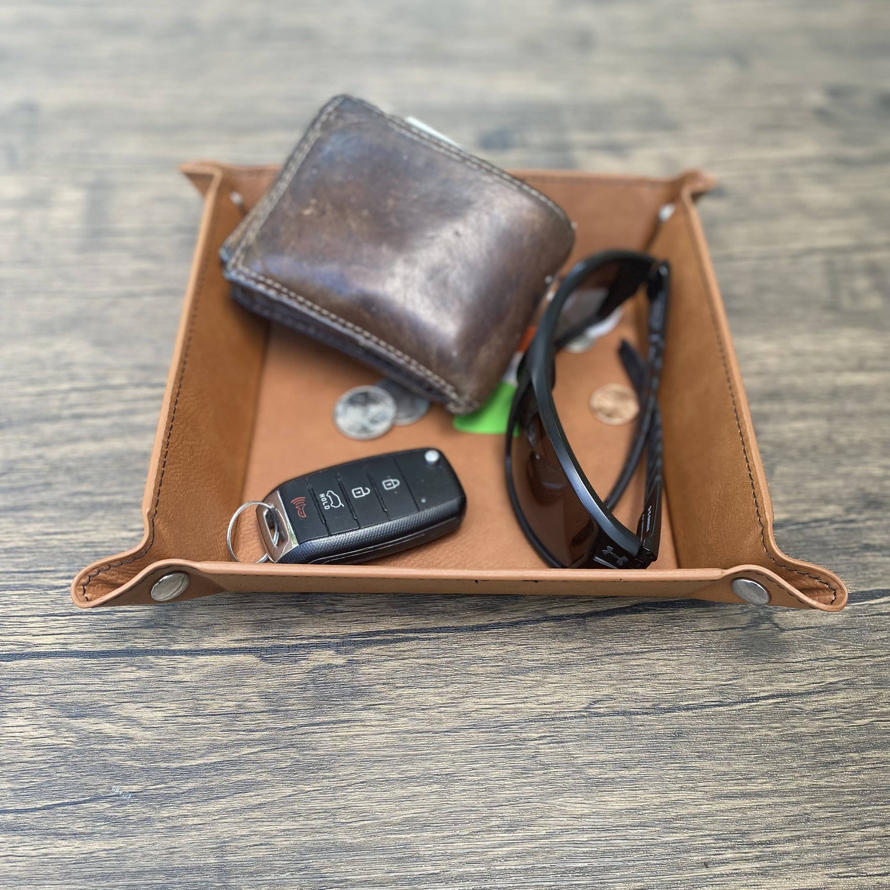 - Our leatherette catchall trays provide the luxurious texture, appearance, and feel of real leather without the high price tag. This water-resistant material is not only easy to clean but also durable enough to endure daily use. - The catchall trays feature authentic stitching along the edges for a touch of elegance and quality craftsmanship. - Inside measures 6x6 inch - Want to add a logo or custom design? Send us a message:)